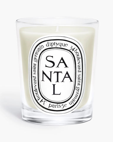 Parisisk Duft af Sandalwood Diptyque Santal Standard Candle præsenterer sig i en gennemsigtig glasbeholder med den karakteristiske etiket fra det p...
