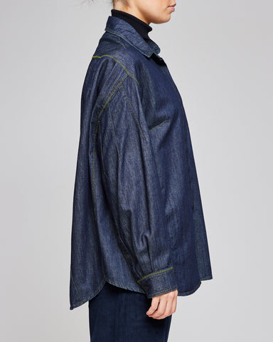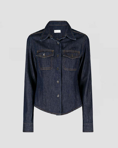 Denim-inspireret skjorteDries Van Noten Indigo Cellie Shirt er syet i 100 % bomuld med tydelige stikninger, der giver et denimlignende udtryk i mør...