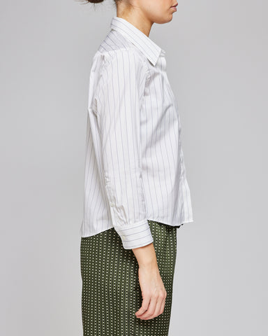 Cropped skjorte med et boxy-fit Dries Van Noten præsenterer en cropped-skjorte i hvid med navy striber, der forener det afslappede med det raffiner...