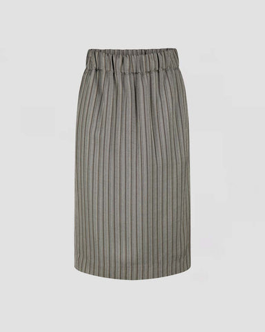 Grå nederdel med striber, skrålommer og elastisk talje. 100% Viscose