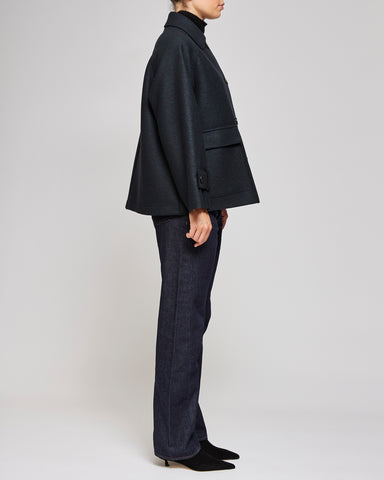 Dark Blue Raglan Jacket Harris Wharf London præsenterer en mørkeblå jakke i Virgin Wool, der forener håndværk med moderne snit. Det karakteristiske...