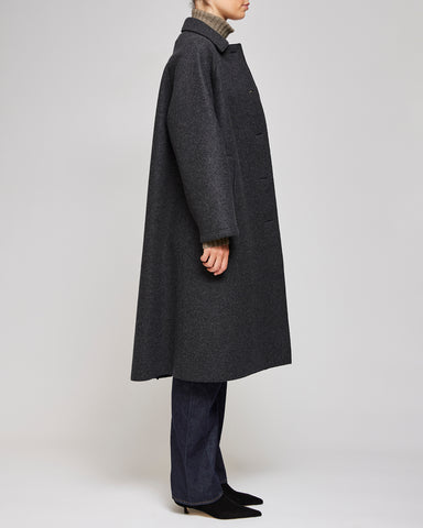 Balmacaan i antracit Harris Wharf London præsenterer en Balmacaan-frakke i presset uld, der forener klassisk skrædderkunst med moderne udtryk. Den ...