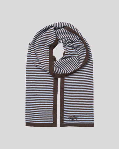 Lola tørklæde i striber Kernemilk Striped Lola Scarf præsenterer et stribet mønster i lyseblå og mørkebrun. Tørklædet er fremstillet af en blanding...