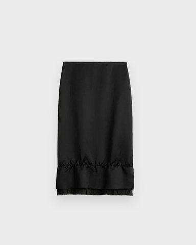 Sort satinnederdel fra TotemeToteme's nederdel er fremstillet i sort med et lagdelt design, hvor en gennemsigtig underdel tilføjer dybde til silhue...