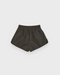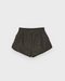 Den elastiske talje med en justerbar snøre. Dette designelement giver mulighed for at tilpasse pasformen efter behov, samtidig med at det tilføjer en visuel detalje til shortsenes front. Snøren er fremstillet i samme olivenfarve som stoffet og bidrager til det sammenhængende udtryk, som kendetegner Cecilie Bahnsens designs.
