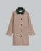 Den mørkegrønne krave er fremstillet som en kontrastfarvet detalje, der adskiller sig fra trenchcoatens ternede mønster. Kraven er formet med præcision og giver trenchcoaten et distinkt visuelt udtryk. Materialet i kraven er bearbejdet for at skabe en struktureret finish, der fremhæver designets opmærksomhed på detaljer og håndværksmæssig kvalitet.